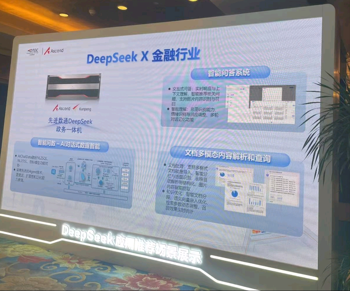 本次大会美港通展示了DeepSeek一体机,向业界全方位展示了其在金融科技领域的创新实力。美港通DeepSeek一体机的文档多模态内容解析和查询功能备受瞩目。它能够对各类金融文档,如研究报告、监管文件、交易记录等进行全方位解析,将文本、图表、图像等多模态信息转化为可高效查询和分析的结构化数据。金融组织借此可快速定位关键信息、洞察市场趋势、防范合规风险,为决策给予有力支持,实现从数据到价值的高效转化。